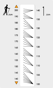 Die optimale Stocklänge muss also individuell bestimmt werden, hier ist auch das subjektive Empfinden jedes Einzelnen mitentscheidend. Ungefähr 70% der eigenen Körpergröße wird als Anhaltswert für die Ermittlung der idealen Stocklänge zugrunde gelegt. Es kann auch die nachfolgende Darstellung für die Ermittlung verwendet werden.